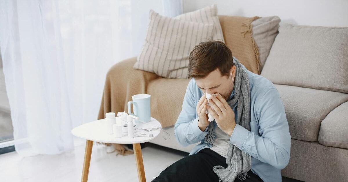 Mann mit Erkältung sitzt auf dem Sofa und benutzt ein Taschentuch, Medikamente und Tee auf dem Tisch